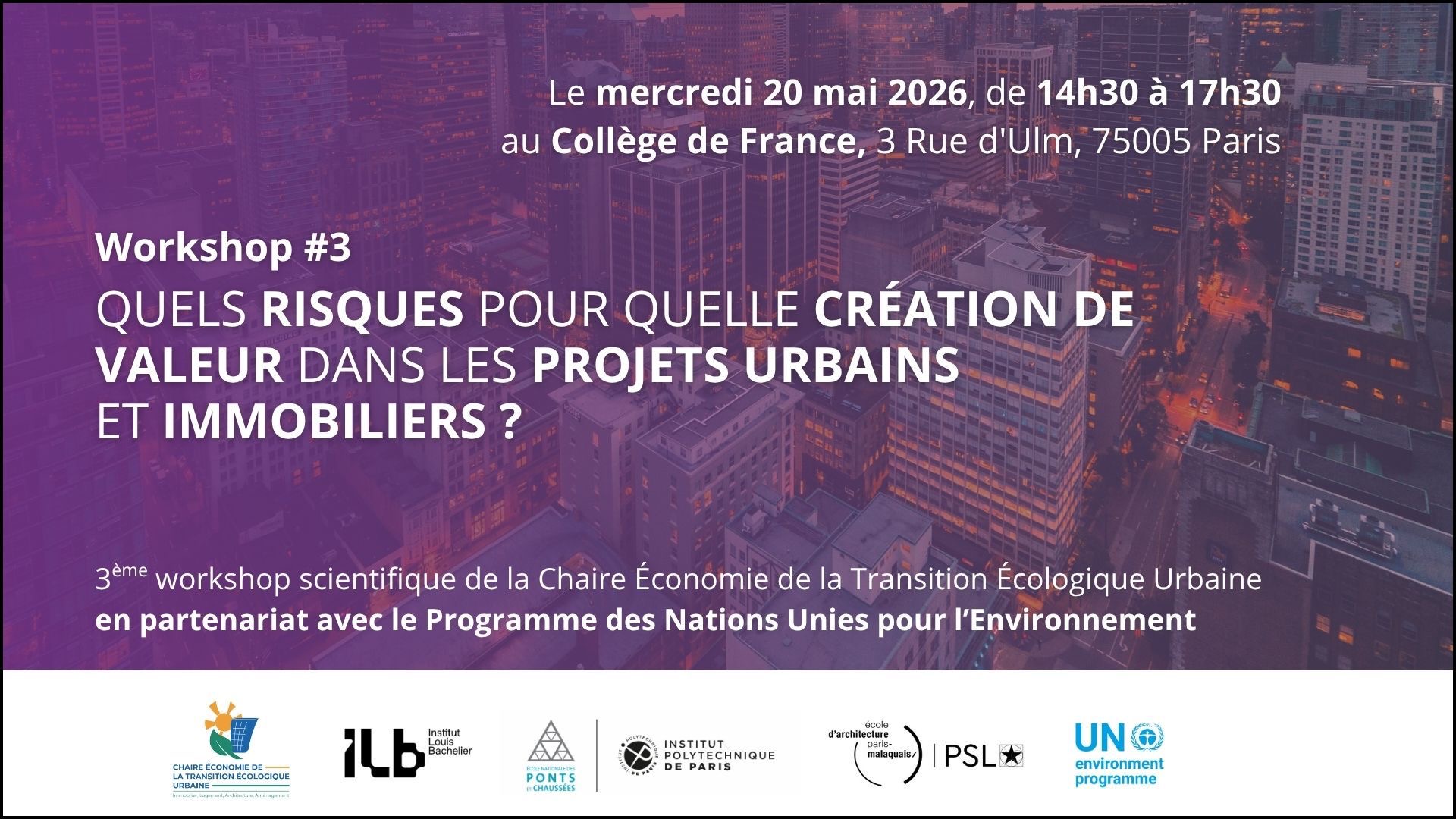 Organisé par le comité scientifique de la Chaire, en partenariat avec le Programme des Nations Unies pour l’Environnement (UNEP), ce troisième workshop scientifique réunira chercheurs, acteurs économiques et professionnels de l’immobilier et de la ville afin d’analyser le fonctionnement économique de la chaîne de valeur des projets urbains et immobiliers, en mettant l’accent sur la perception, la répartition et la rémunération des risques entre les différents acteurs.